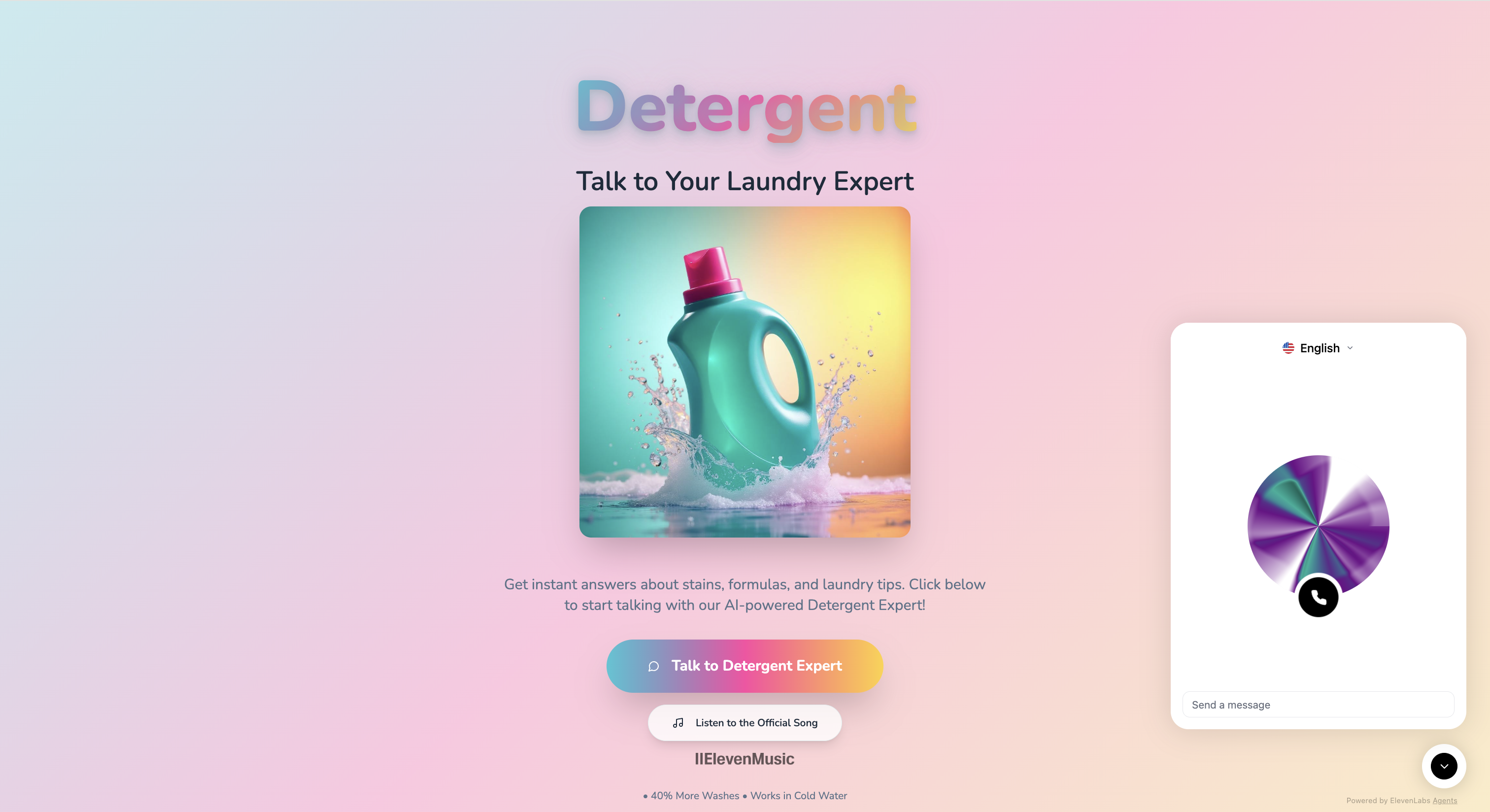 For a CPG (consumer packaged goods) prospect, another demo took a completely different angle: a fake detergent brand with an AI personality. It was a blueprint for how consumer brands could turn product support into an engaging, voice-first experience.